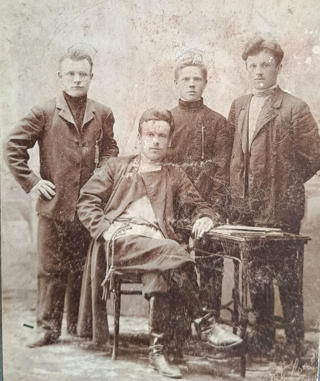 1) На фотографии – братья Ржавины (уроженцы деревни Васькино Вятской губернии), город Казань, приблизительно 1906 год: стоят (слева направо) Вячеслав, Александр (на снимке ему около 14-15 лет), Павел; сидит Михаил..